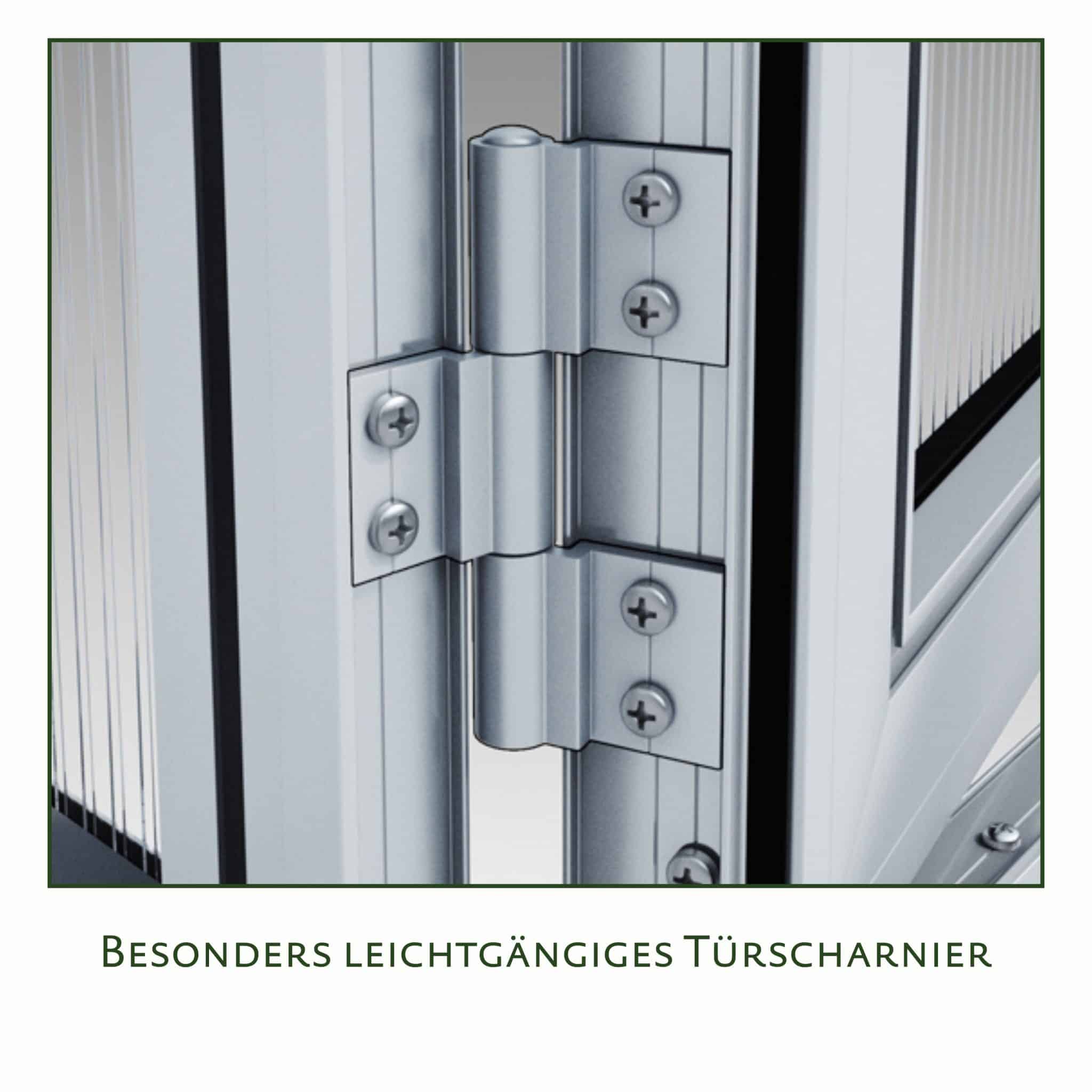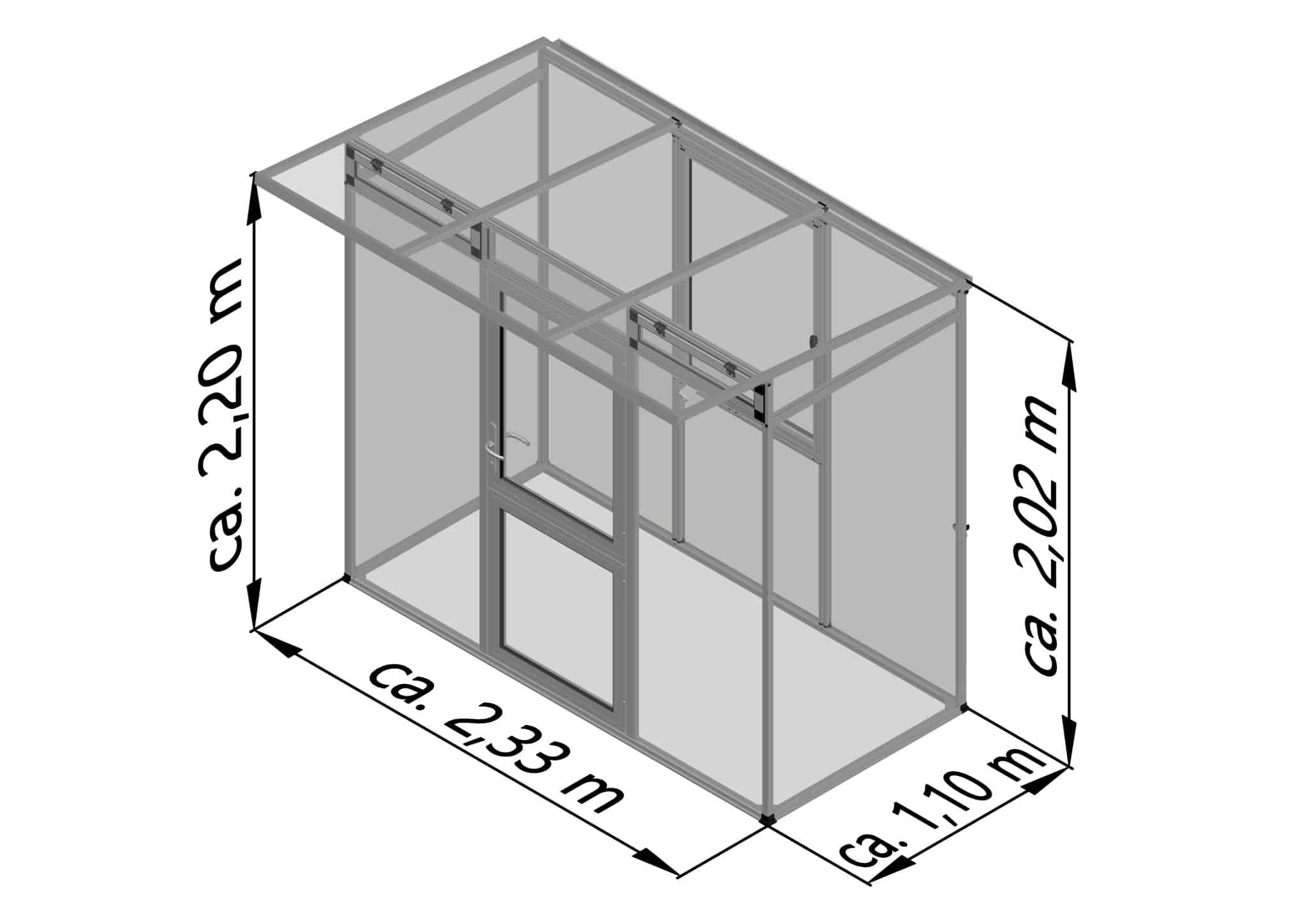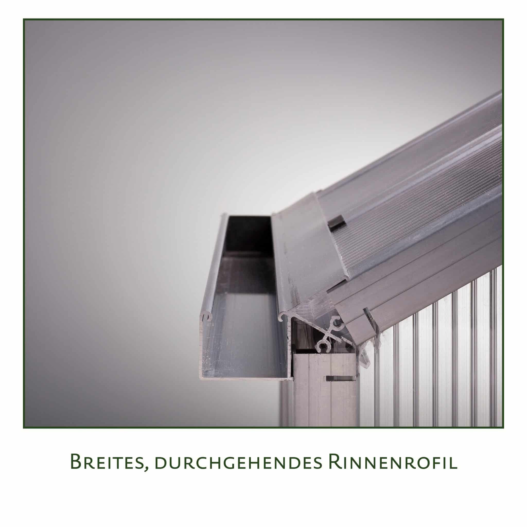 Jatkuvat alumiiniprofiilit ja hienostunut lasitustekniikka ilman kiinnikkeitä ja muovilistoja takaavat paitsi valtavan vakauden myös korkean turvallisuustason. Leveä, jaettu saranoitu ovi lukittavalla ovenkahvalla varmistaa kätevän ja suojatun pääsyn kasvihuoneeseesi. Suuri takaseinän ikkuna manuaalisella avaajalla ja kaksi etuikkunaa – myös manuaalisilla avaajilla – varmistavat hyvän ilmanvaihdon, jotta kasvisi saavat optimaaliset kasvuolosuhteet. Sadevesi voidaan kerätä kastelua varten syöksytorven avulla varustetun rännin kautta. Voit laajentaa kasvihuonetta KGT-ripustushyllyllä, pöytärungolla tai kasvialustalla.