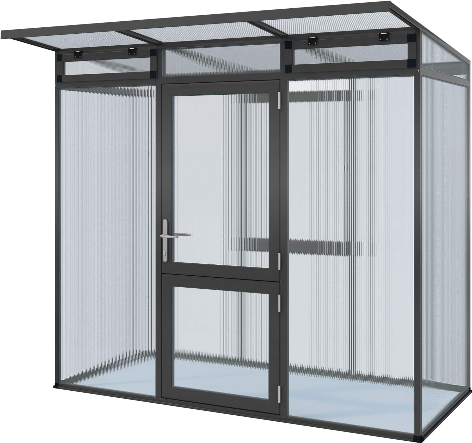 Linea-kasvihuone (väri: antrasiitinharmaa DB 703) 10 mm:n kennolevyllä ei vakuuta ainoastaan harmonisella muotoilullaan, harjakaton rakenne varmistaa myös hyvän valonsaannin ja mukava seisomakorkeus mahdollistaa ergonomisen puutarhanhoidon.