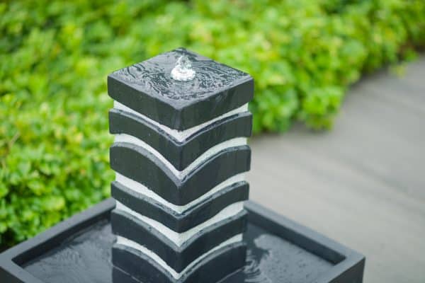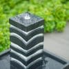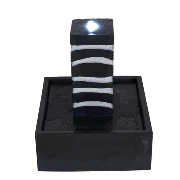 Tässä neliönmuotoisessa, elegantissa marmorin jäljitelmäpylväässä, jossa on aaltoilevia uria koko pinnalla, väri musta, vesi virtaa LED-valaistun ulostulon läpi ja tippuu varovasti samanväriseen altaaseen.  Ubbinkin täydellinen Borgo-suihkukaivo, joka on valmis heti käyttöön